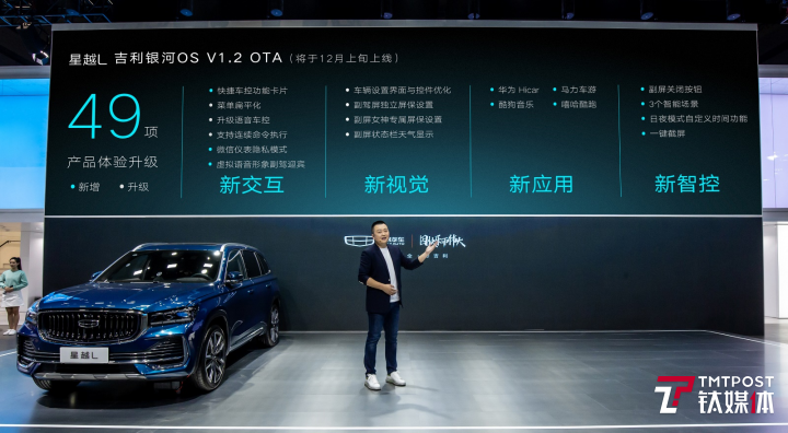 此次车展,吉利汽车还正式发布了星越L搭载的吉利银河OS整车功能OTA,共有49项产品升级。此前,星越L在今年8月就为用户带来了一次吉利银河OSV1.1版本升级,在交互、视觉、应用、智控4个方面为用户带来了17项新的智能体验,如主驾极客模式、微信、全民K歌、火山车娱、副驾专属蓝牙等。