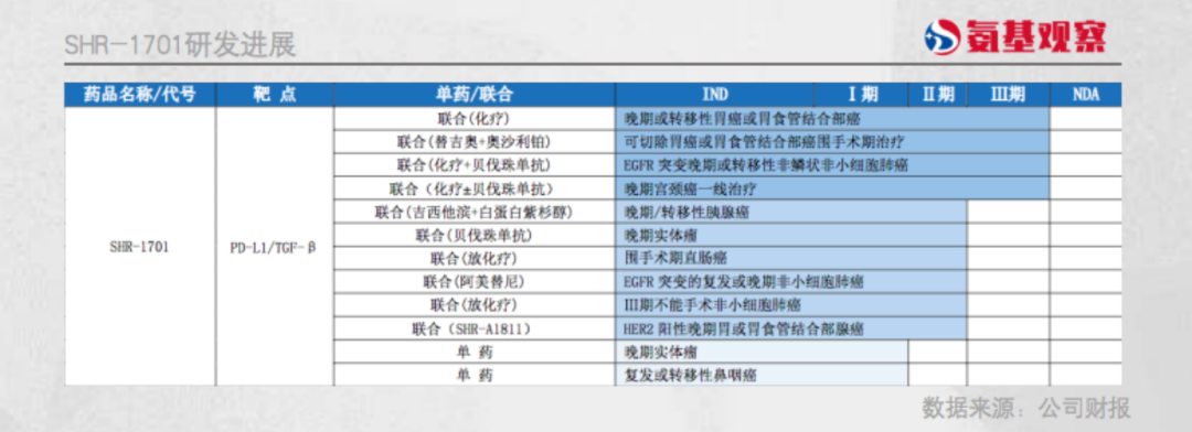 比如SHR-1701作为PD-L1/TGF-β,跟随的对象是德国默克。虽然默克四次折戟,PD-L1/TGFβ双抗的未来充满变数,但恒瑞医药给出的答案是,死磕。截至目前,围绕SHR-1701,共有12个适应症,其中4项进入3期临床。