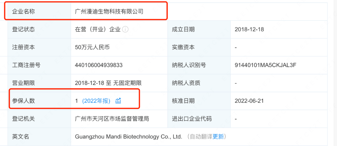 企查查显示,2022年漫迪生物的参保人数仅有1人。
