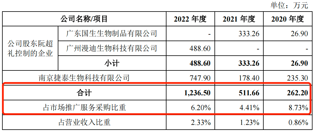招股书显示,报告期内,卓谊生物向部分关联方采购市场推广服务金额分别为262.20万元、511.66万元和1236.50万元,占市场推广服务采购比重分别为8.73%、4.41%和6.20%。