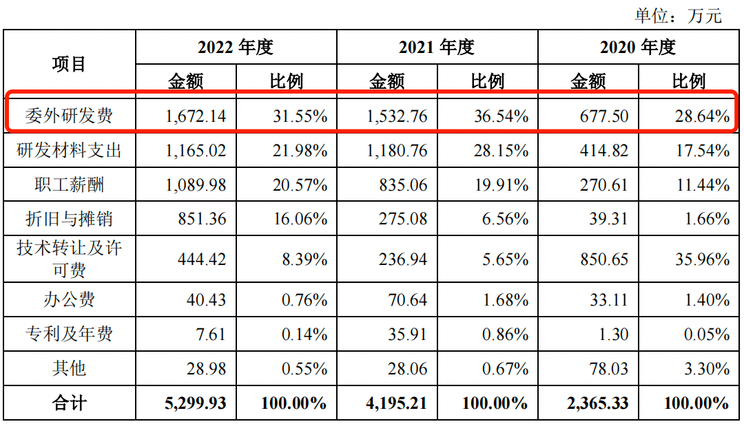 招股书显示,报告期内,公司的委外研发费分别为677.50万元、1532.76万元和1672.14万元,占当期研发费用的比例分别为28.64%、36.54%和31.55%。