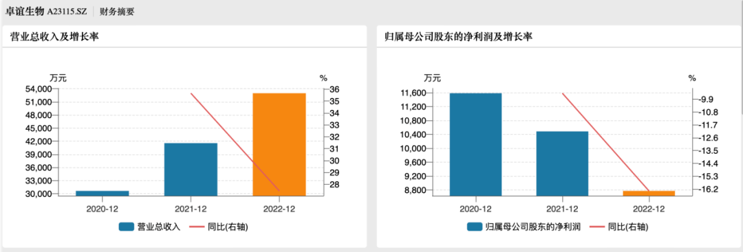 招股书显示,2020年-2022年(以下简称“报告期”),卓谊生物的营业收入分别为3.06亿元、4.16亿元和5.30亿元;同期归母净利润分别为1.16亿元、1.05亿元和8773.63万元。