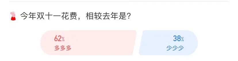 当大众都感觉自己及身边人消费在降级时,一次大促活动让大家再次展现“敢花”能力,买起高客单价的电子产品、大家电或是囤旅游产品时,依然不手软。一项针对双十一的非正式小调查结果显示,62%的参与者表示今年的花费要比去年多。