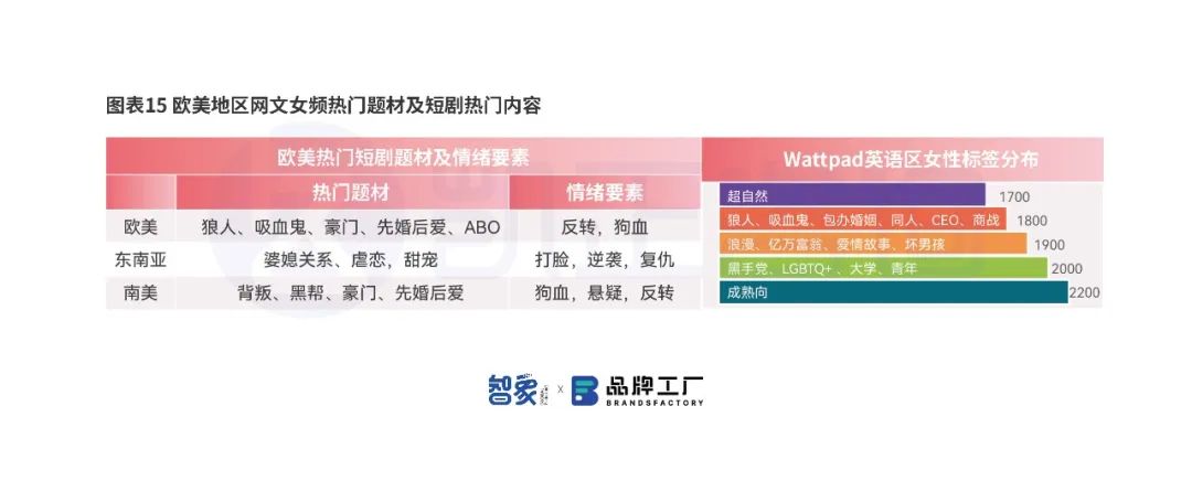 在短剧选取的热门题材上,女频题材在多个地区之间都有普适性,情绪线仍是以和高贵身份男主恋爱先抑后扬的爽文为主流,情绪上都以反转、逆袭、复仇等元素为主。尤其在短剧中,对于反转的节奏要求更高,对于爽点的要求更加密集。而在不同的地区,对于男主的身份设定,故事背景,以及宗教导致的内容尺度略有不同,例如欧美地区的女性对于亲密戏描写的尺度较大。东南亚多以青春小说和中国小说本土化翻译版为重点,本土化成本较低。