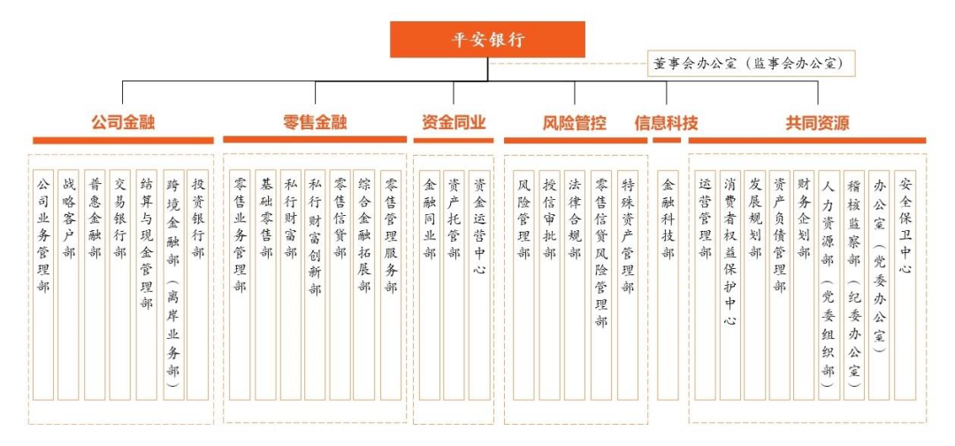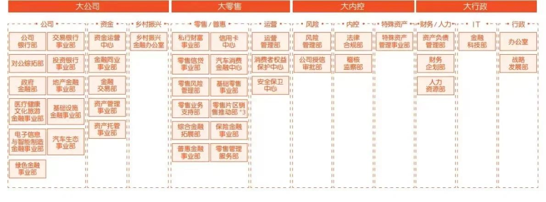 从总行部门设置来看,平安银行由此前的43个(3个零售片区销售推动部算1个),变成了32个。总行部门设置也由之前的大公司、大零售、大内控、大行政四大模块,调整为公司金融、零售金融、资金同业、风险管控、信息科技、共同资源六大板块。