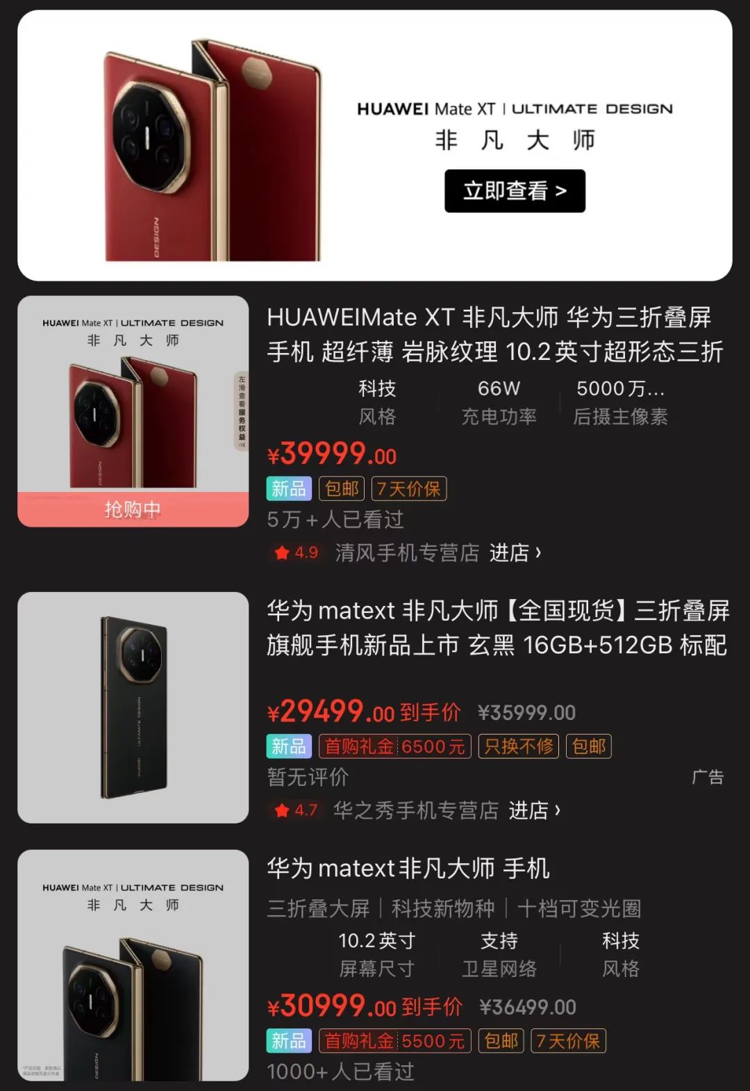 而此后三天,二级市场的走向正如老周所预料,无厘头的疯狂溢价很快便随着时间而消退——512GB、黑色款华为Mate XT最先吹响降价的号角,在短短几天内从加价2万元猛跌至5000到6000元,而其他型号亦未能幸免,跌势迅速波及全线。