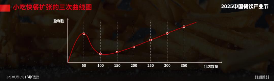 我总结了小吃快餐扩张的三次曲线图,最开始有十几家门店、二三十家门店是最舒服的,因为这些门店都集中在一个城市,老板一个人就能管理过来,也不需要专业的供应链支持,所以成本很低,利润很高。