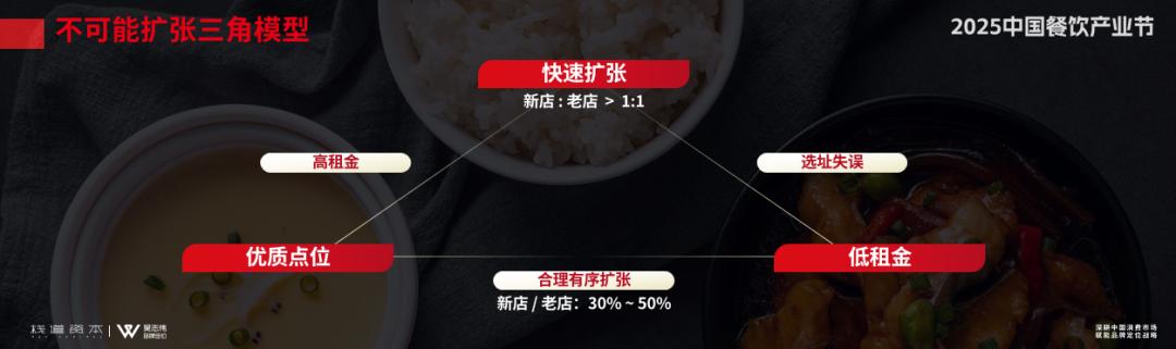 我们还提出了不可能扩张三角模型,在快速扩张、优质点位和低租金不可能同时达到,你要快速扩张且低租金的话,就不可能拿到优质点位;你要快速扩张+优质点位,就不可能拿到低租金,如果你要优质的点位又要低租金的话绝对不可能快速扩张。