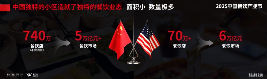 餐饮也是一样的,如今中国有七八百万家餐饮店,市场容量大概是5万亿元人民币左右,和美国市场相近,但是美国只有七八十万家店,且每一家餐饮店容量或收入大概是我们的10倍。这就解释了为什么我们的餐饮行业如此艰难,因为市面上每一家店都是你的竞争对手。