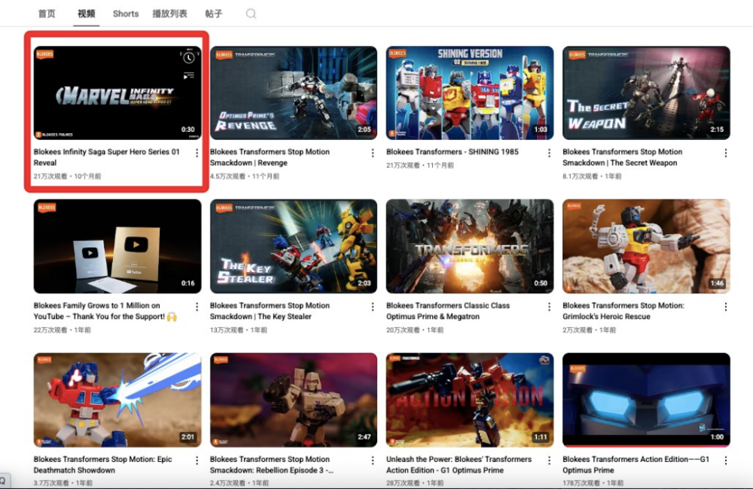 布鲁可与变形金刚系列在北美的爆发,早有铺垫。去年1月,布鲁可开设官方Youtube频道,大量发布变形金刚系列玩具的定格动画。在7个月里,这些视频帮频道轻松涨粉100万。而且,频道前10个月,几乎只推变形金刚,没有其他IP。