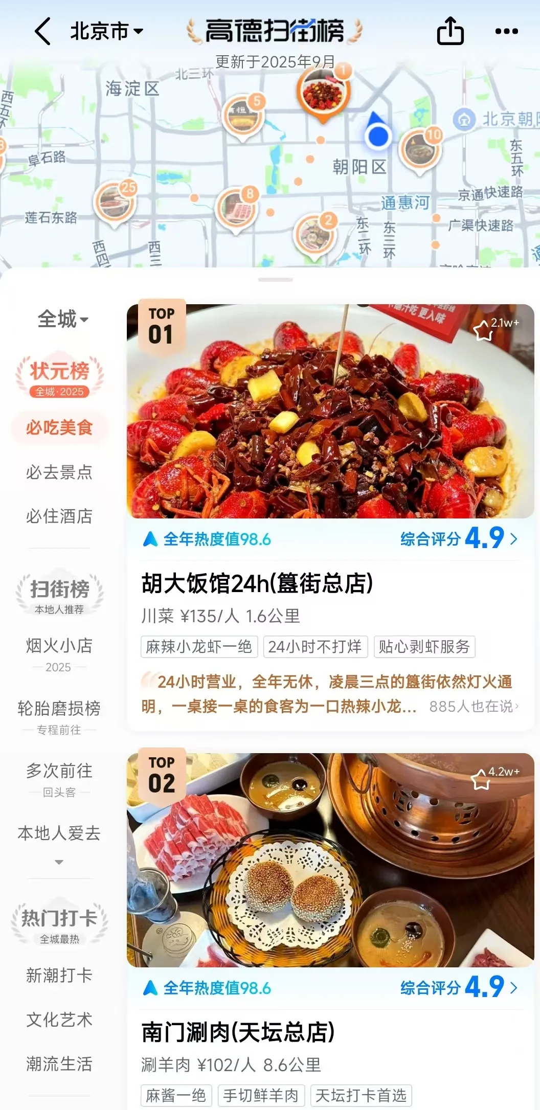 结果就是发布了对标美团大众点评榜单的“高德扫街榜”,对商家进行综合评分、排名,涵盖美食、景点、酒店等多种业态。