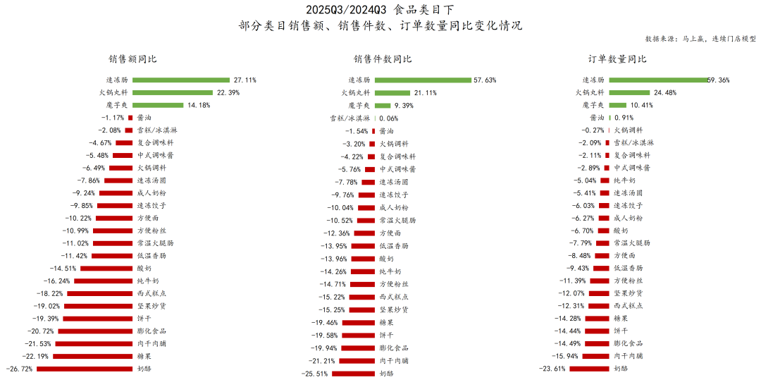从整体来看,2025Q3食品类目中,速冻肠、火锅丸料、魔芋爽成为少数在销售额、销售件数、订单数量三个指标上均实现同比增长的类目,表现亮眼。虽然三个类目整体的规模都不算大,在诸多的传统食品类目中也都可以算是“新兴产品”,但其较好的涨势或许也体现出了消费需求的变化趋势----围绕着方便、健康、多样化进行产品形态的延展与创新。