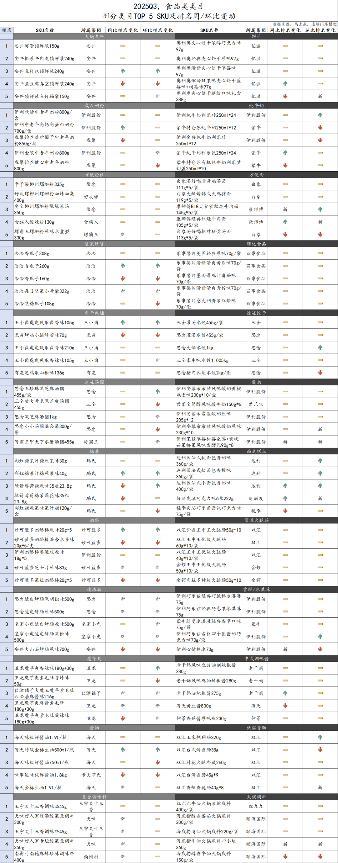 在本季度食品类类目的Top SKU变动上,几个点的变化值得关注: