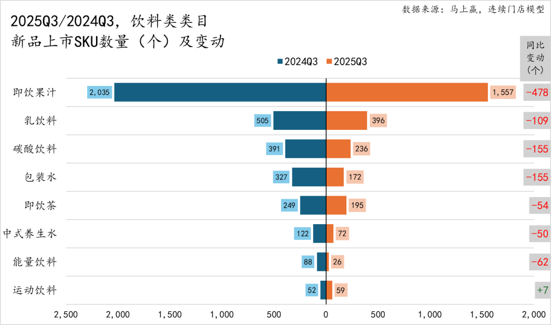 从品类分布看,即饮果汁依旧是上新数量最多的板块,本季新增1,557个SKU,虽同比减少478个,但仍远超其他饮料类别,稳居创新主阵地。另一方面,前两年迅速崛起的中式养生水则出现明显降温,上新数量从122个降至72个,跌幅接近四成。考虑到该类目此前的高关注度与高速增长,这一变化可能意味着市场已进入阶段性瓶颈:一方面玩家蜂拥而入、同质化突出;另一方面消费者对“健康”“天然”卖点的期待提升,但产品创新与体验尚未跟上。