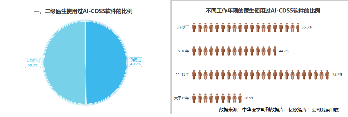 临床端对AI的接受度已然发生根本性转变。中华医学期刊数据库显示,一、二级医院中近半数医生已使用AI临床决策支持系统(AI-CDSS),其中工作年限在11-15年的医生使用率最高,达72.7%,5年以下的使用率为56.6%,年轻与中年医生相对更易接受并使用Al辅助工具。