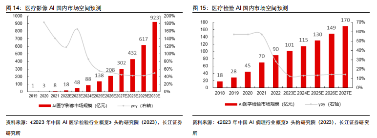 AI医学检验与AI制药则成为行业的“潜力股”。慧博智能投研数据显示,2022年AI检验市场规模已逼近百亿元,预计2022-2027年保持13.56%的年复合增速,2027年将达170亿元。2023年其渗透率不足9%,未来提升空间巨大,其中最具发展潜力的细分领域是AI辅助诊断。