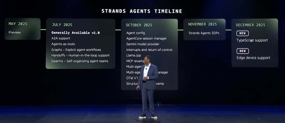 目前 Strands Agent SDK 已经开源,本次新增支持 TypeScript,同时支持边缘设备,自五月份以来下载量已超过 500 万次。
