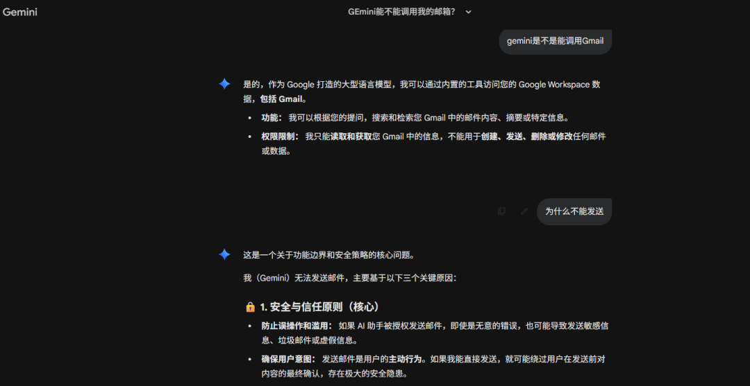 在涉及到用户隐私的应用,如邮箱时,谷歌表现得非常克制,Gemini只有在用户请求时才会调用相关数据,且不会进行发布邮件等敏感行为。