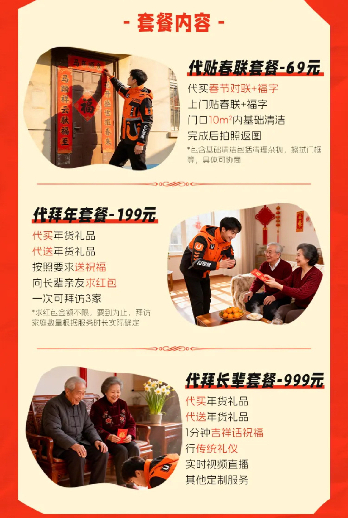 从此前UU跑腿官方宣传海报及服务细则来看,推出的代拜年服务共分三档套餐。69元代贴春联套餐,包含代买张贴春联福字及门口基础清洁;199元代拜年套餐,可代买代送年货、传递祝福并向长辈亲友求红包,一次可拜访3家;999元代拜长辈套餐中,除代买送年货外,还涵盖1分钟吉祥话祝福、行传统礼仪及实时视频直播等定制服务,而行传统礼仪便包括代磕头行礼。