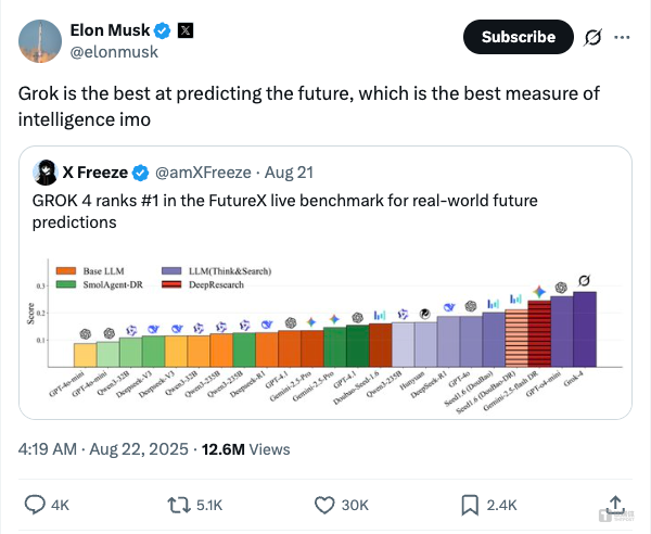 Grok-4以25.9分排在第18位。马斯克曾公开断言:“预测未来的能力,是对模型智能性最好的测试。”