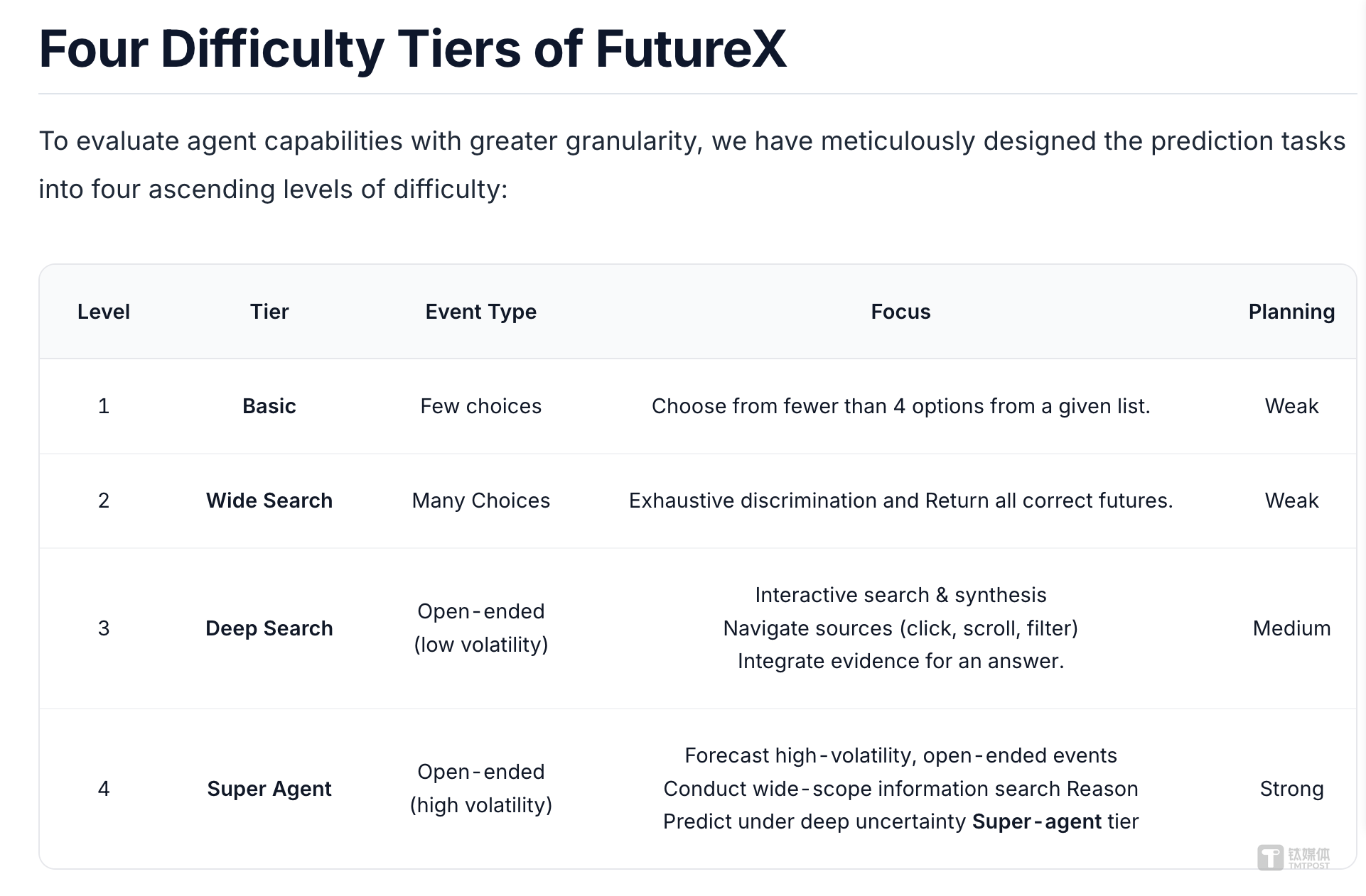 FutureX采用的是“折叠式”评分逻辑,拒绝模型靠蒙对简单的“是与否”来刷分。它大幅压缩了二元对立事件的数量,并将难度分为四个等级: