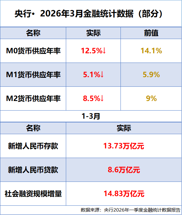 央行2026年3月重要金融数据一览:M2同比增长8.5%,一季度社融规模增量累计为14.83万亿元