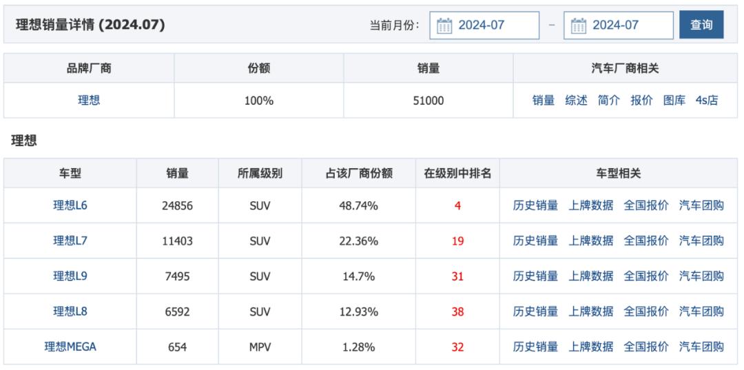 据车主之家数据,2024年7月,理想L6、理想L7、理想L8、理想L9、理想MEGA销量分别为24856、11403、6592、7495、654辆,其中L6销量占比为48.74%。