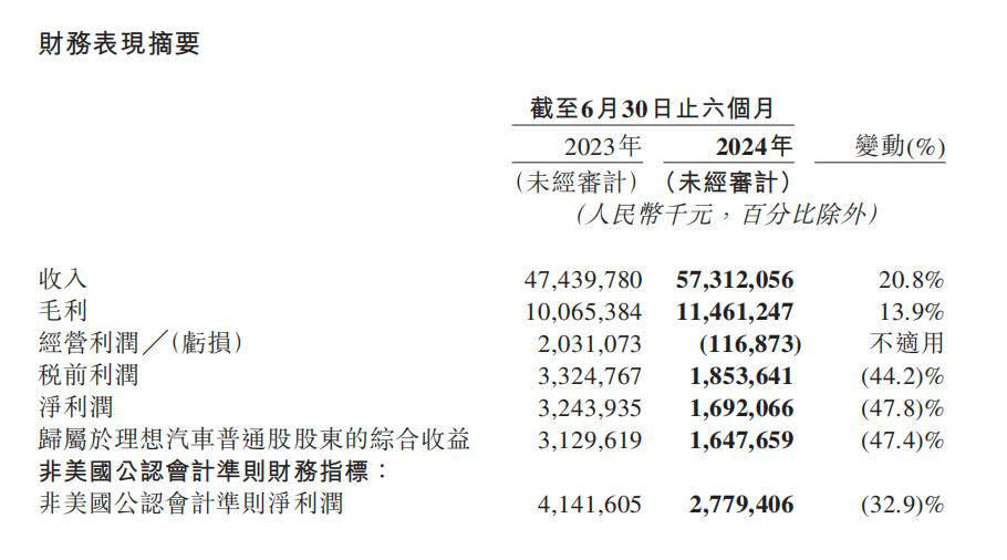 8月28日,理想汽车2024年半年报出炉。财报显示,理想上半年录得营收573.1亿元,同比增长20.8%;其中车辆销售收入达到545.7亿元,同比增长17.9%;归母净利润为16.9亿元,同比下滑47.8%;调整后净利润16.5亿元,同比下滑47.2%。
